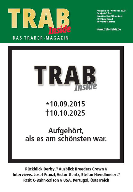 Die letzte Ausgabe wurde an die Abonnenten versandt und ist außerdem auf den Rennbahnen Berlin-Mariendorf und Hamburg-Bahrenfeld erhältlich. Damit ist das Projekt TrabInside nach über zehn Jahren beendet.
